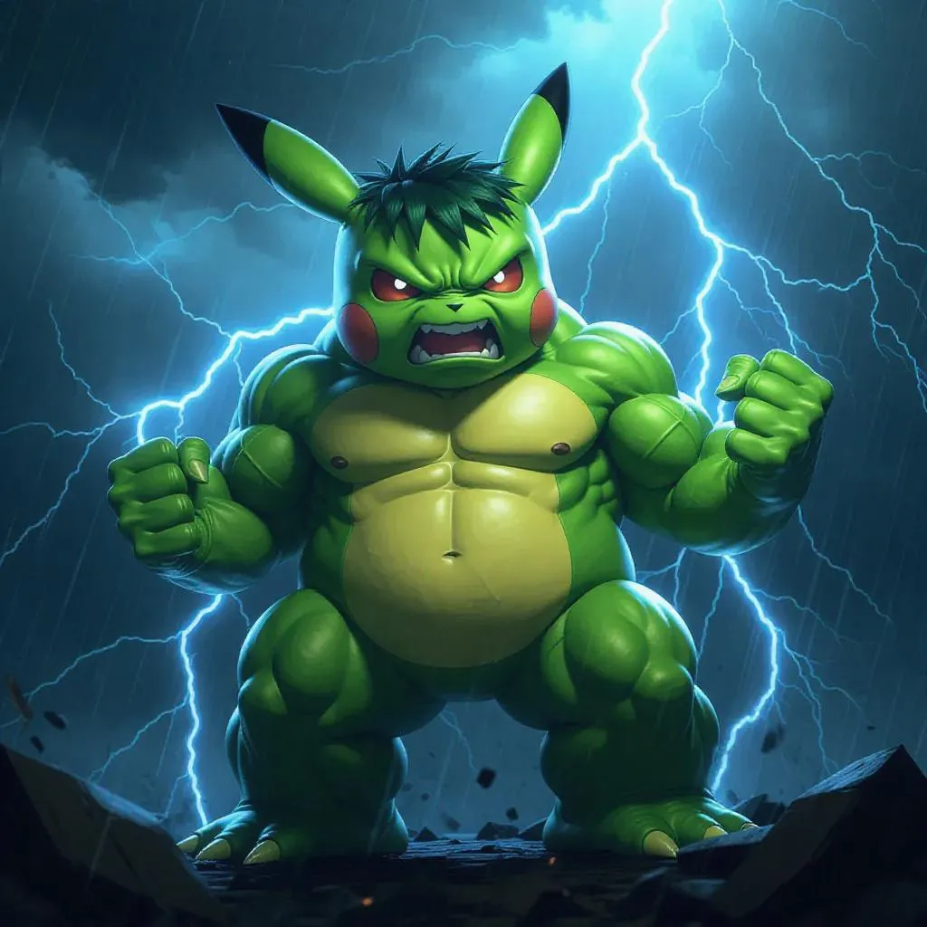 Pikachu Hulk, towering and emerald-green, eyes blazing with fury, muscles bulging, electric sparks crackling around his fists, set against a dark, stormy sky with lightning bolts.