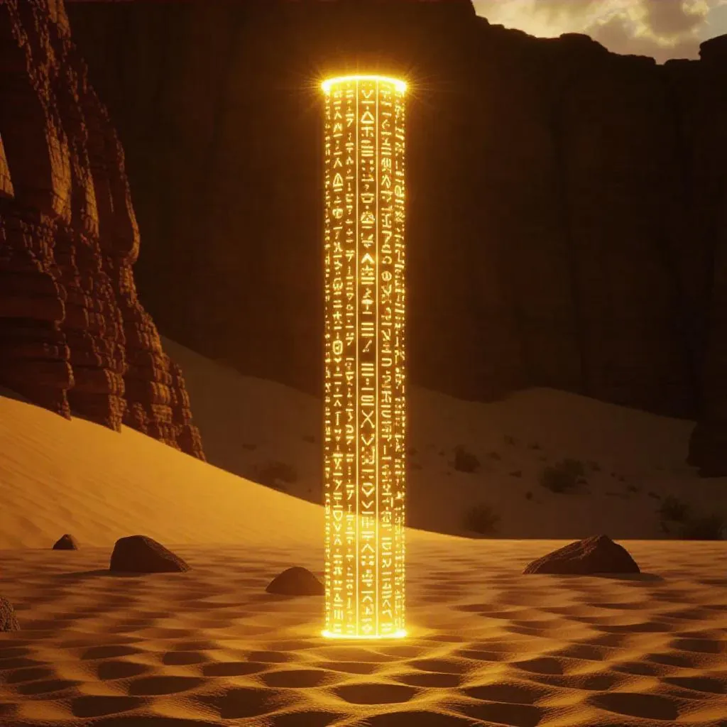 Mesmerizing AI-generated 3D visualization of an ancient desert ritual featuring a glowing golden pillar etched with mystical hieroglyphs. Witness concentric energy portals, intricate sand symbols, and shadowed figures in this hyper-detailed scene blending archaeological mystery with cosmic wonder. Perfect for mystical themes or otherworldly storytelling.