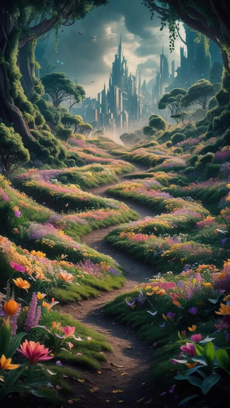 Explore a vivid 3D cinematic scene where untamed wilderness meets futuristic cityscapes. Wander vibrant, petal-strewn forest paths leading to a mysterious metropolis, its towering structures piercing the sky. AI-crafted flora bursts with color, blending nature’s chaos with urban intrigue. Perfect for cinematic storytelling, adventure themes, or immersive world-building with professional-grade visual effects. #3D #Cinematic #AIArt #FantasyCityscapes