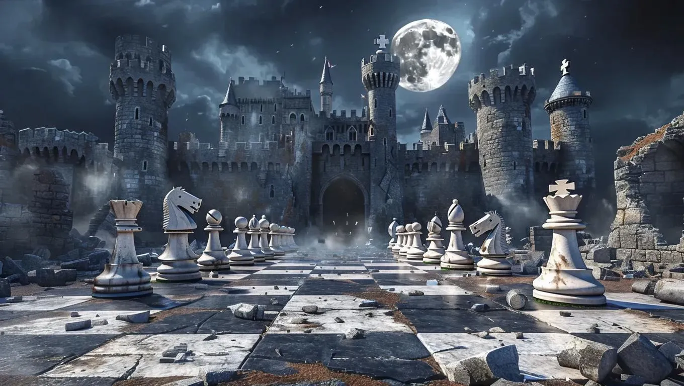 Majestic medieval castle under ethereal moonlight sets the stage for animated chess chaos. Rust-armored knight pieces shatter dramatically, casting haunting shadows. Ruined chessboard symbolizes power's transient nature and victory's fleeting essence. AI transforms text into vivid scenes of strategy, decay, and moonlight grandeur.
