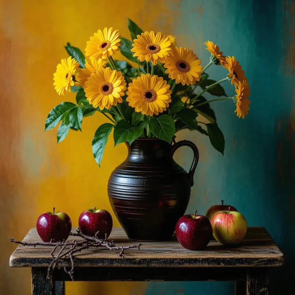 Create 19th-century-inspired still life art with AI. Vintage retro colors enhance rustic wooden tables, textured vases of yellow gerberas, and glossy red apples. Use vivago.ai's Global Illuminations effect for warm earthy tones and focal compositions against multicolored walls. Transform prompts into professional visuals with curated AI tools for timeless, vibrant retro aesthetics.