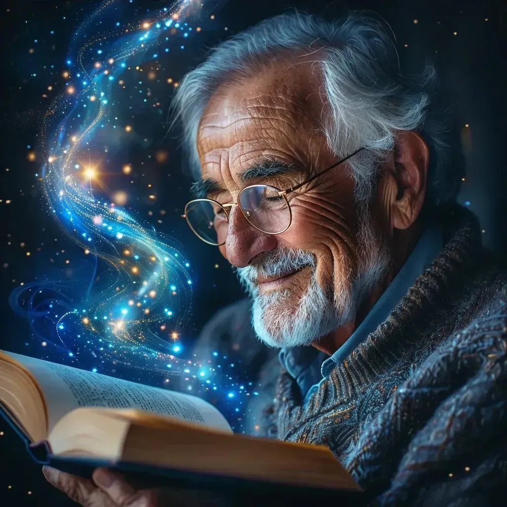 Create a stunning AI-generated image of a serene elderly man with glasses reading a book, radiating calmness with a subtle smile. Side-view composition highlights luminescent aura, ethereal details, and translucent effects. UHD masterpiece showcasing vivago.ai's professional-grade AI tools for hyper-detailed, reflective visuals and artistic brilliance.