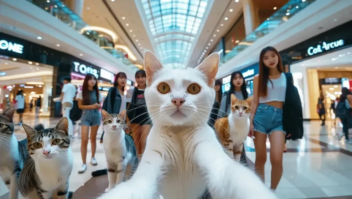 Create AI-generated images of a teenage white cat in trendy shorts snapping a vibrant selfie with friends at a bustling mall. Elevate your visuals with vivago.ai's AI effects and editing tools, perfect for crafting playful, social-media-ready scenes blending youthful fashion and dynamic urban energy.
