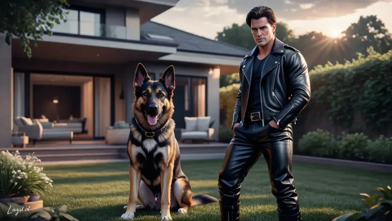 Generate a dynamic 3D AI image of a young man in black leather biker attire standing confidently in a backyard, accompanied by a loyal German Shepherd. Vivago.ai crafts lifelike AI visuals with striking textures, perfect for edgy fashion portraits or pet-owner themed digital art creations.