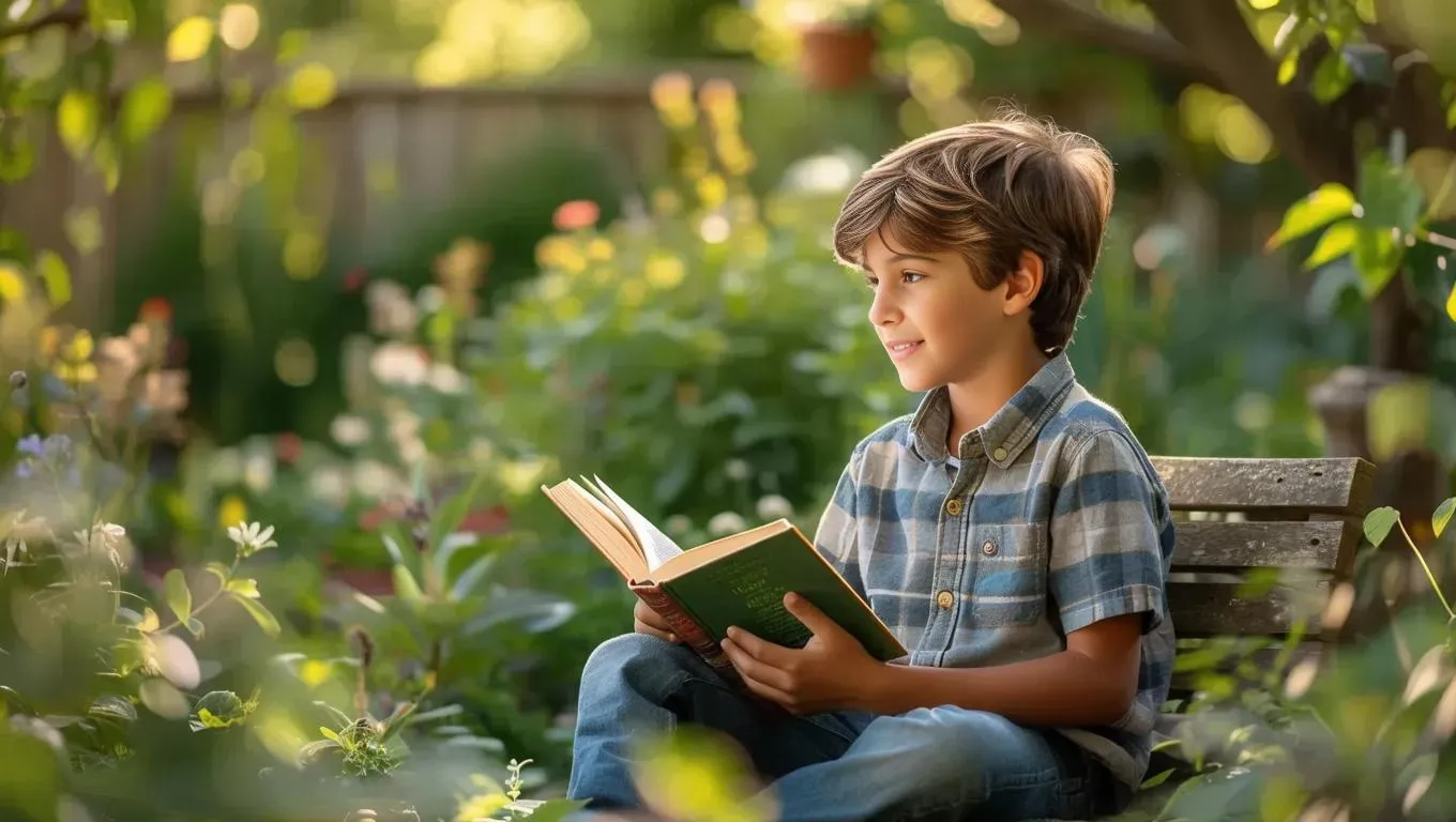 Generate a lifelike image of a 20-year-old man discussing books in a serene garden setting using AI-powered tools. Transform text prompts into vivid visuals with precise age representation, natural outdoor lighting, and engaging storytelling elements through advanced image generation technology for creators and content developers.