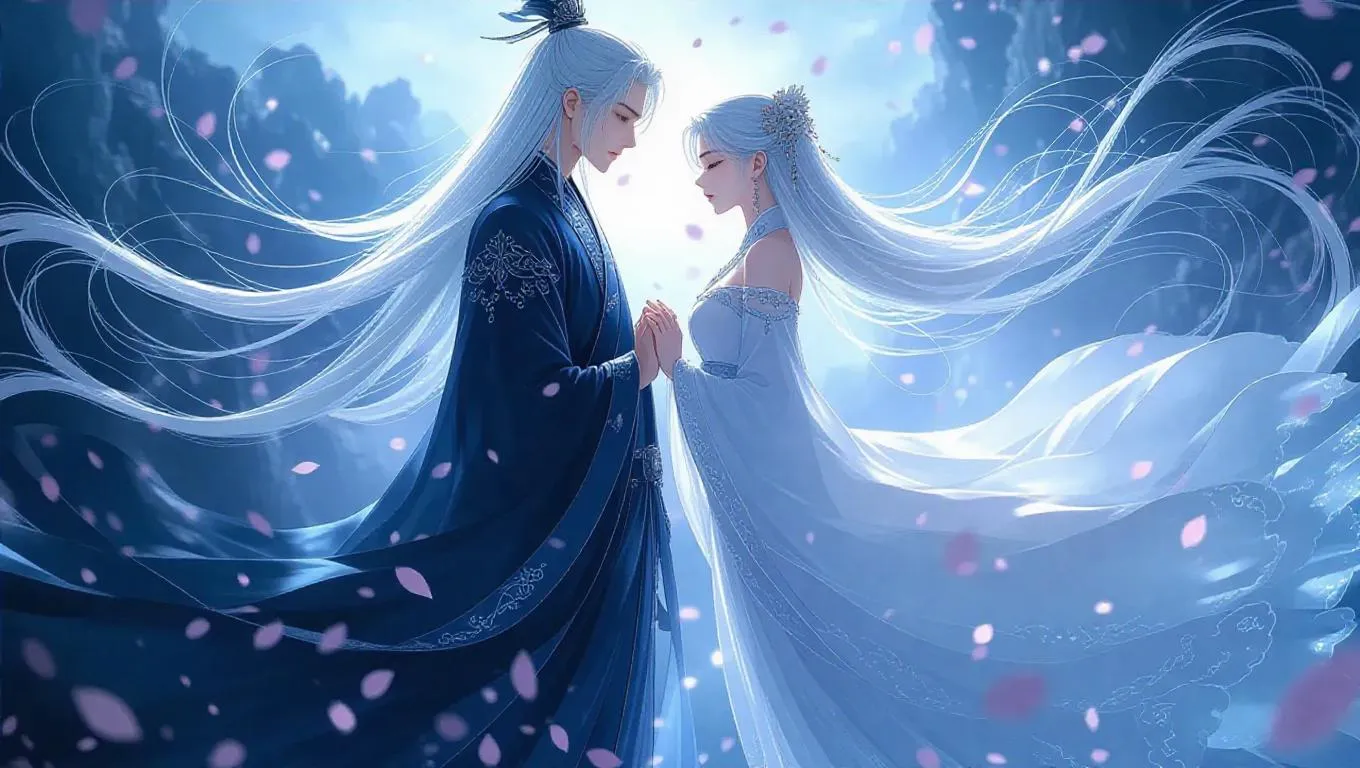 Two flying elegant figures from Chinese anime, a man and a woman with long silver hair and exquisite flowing robes, soaring through a celestial landscape, their eyes locked in a tender gaze, surrounded by ethereal light and floating petals, symbolizing their deep and eternal love.