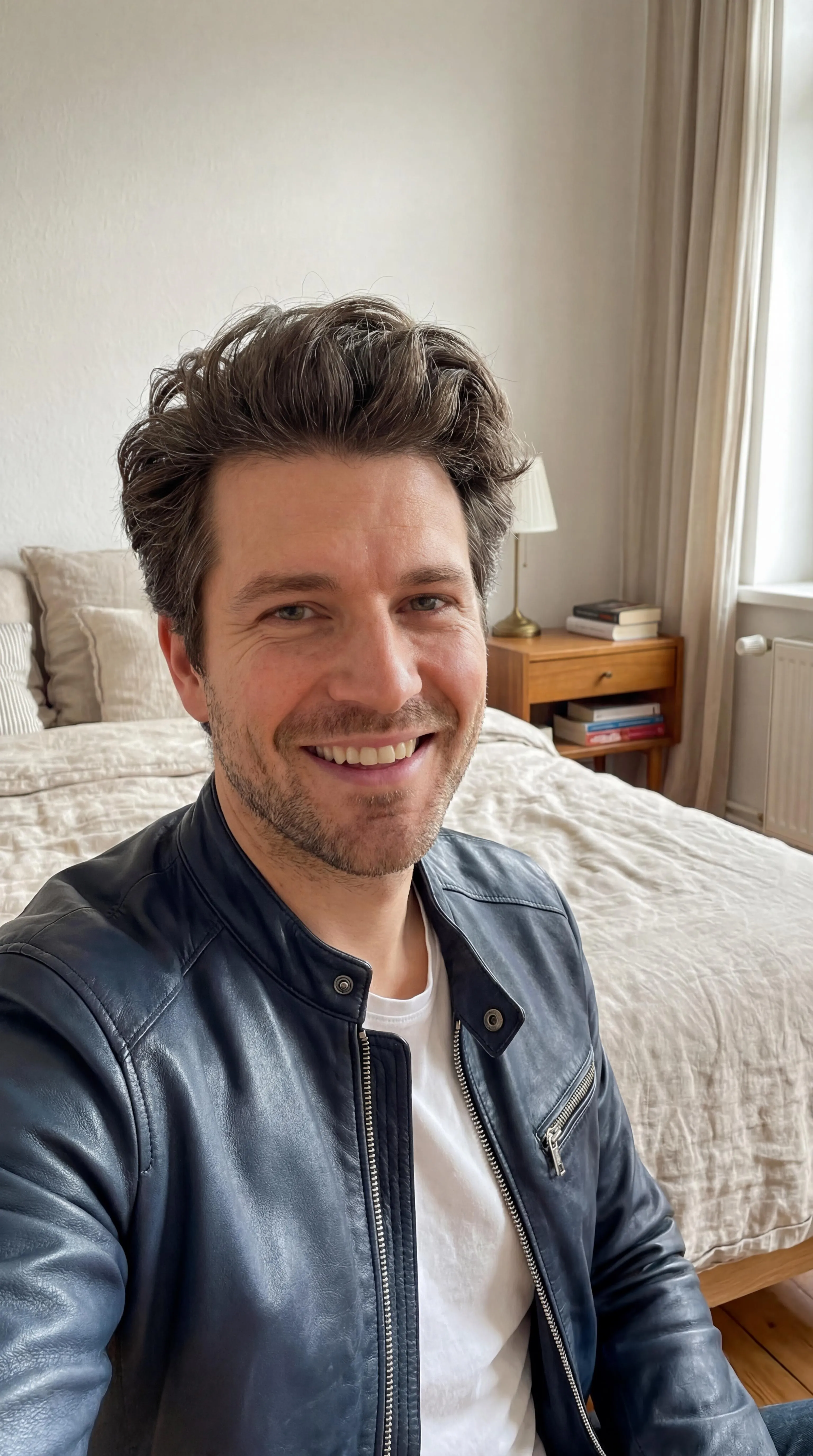给这位男士换一件帅气的衣服,背景是家里卧室