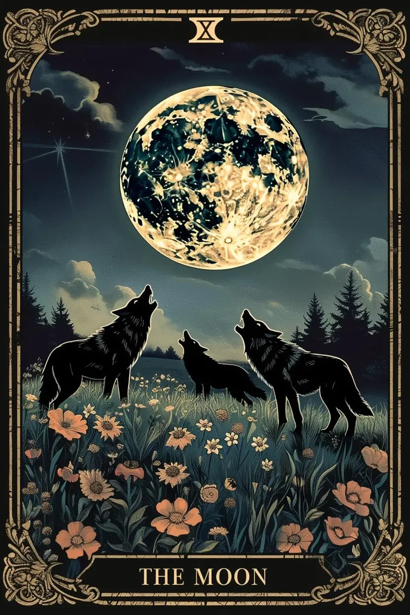 Generate mystical AI Tarot cards like "The Moon" with vivago.ai. Transform text prompts into medieval-style designs featuring dark skies, glowing moons, flowery fields, and howling wolves. Use AI effects to craft symbolic, professional-grade Tarot visuals for spirituality and mysticism projects.