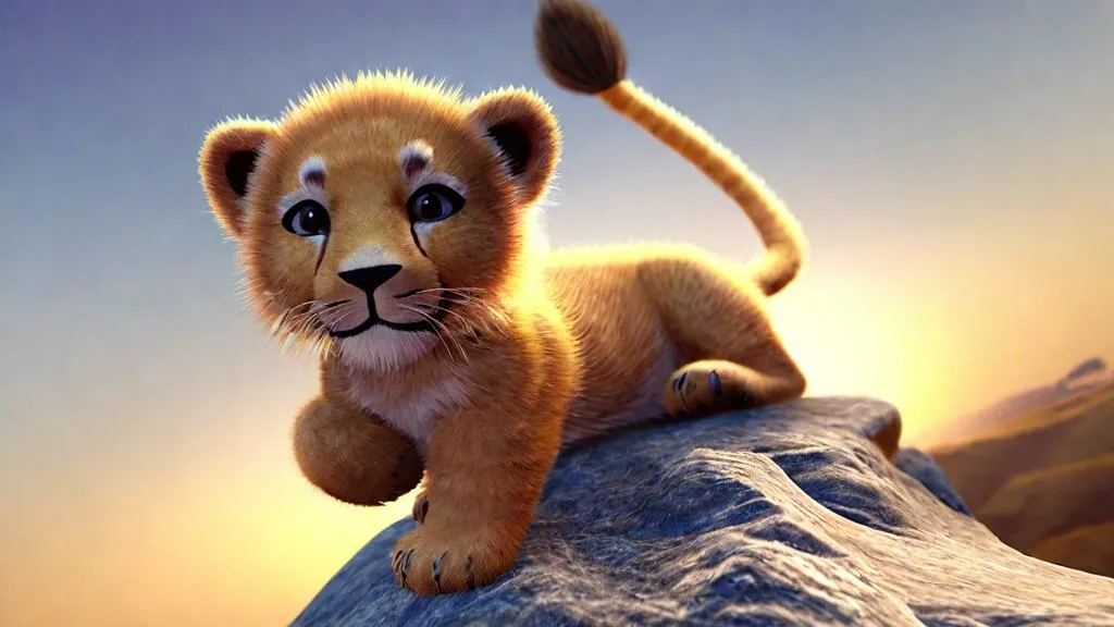 Create captivating YouTube thumbnails with AI: vibrant cartoon-anime lion cub on a golden savannah cliff, "Mufaza" in glowing 3D title. DSLR-quality zoom lens sharpens the cub against blurred mountains, sunlit skies. Warm colors, soft lighting, cinematic effects for professional, eye-catching visuals. Perfect for creators seeking dynamic, high-quality thumbnails with AI-powered precision and artistic flair.