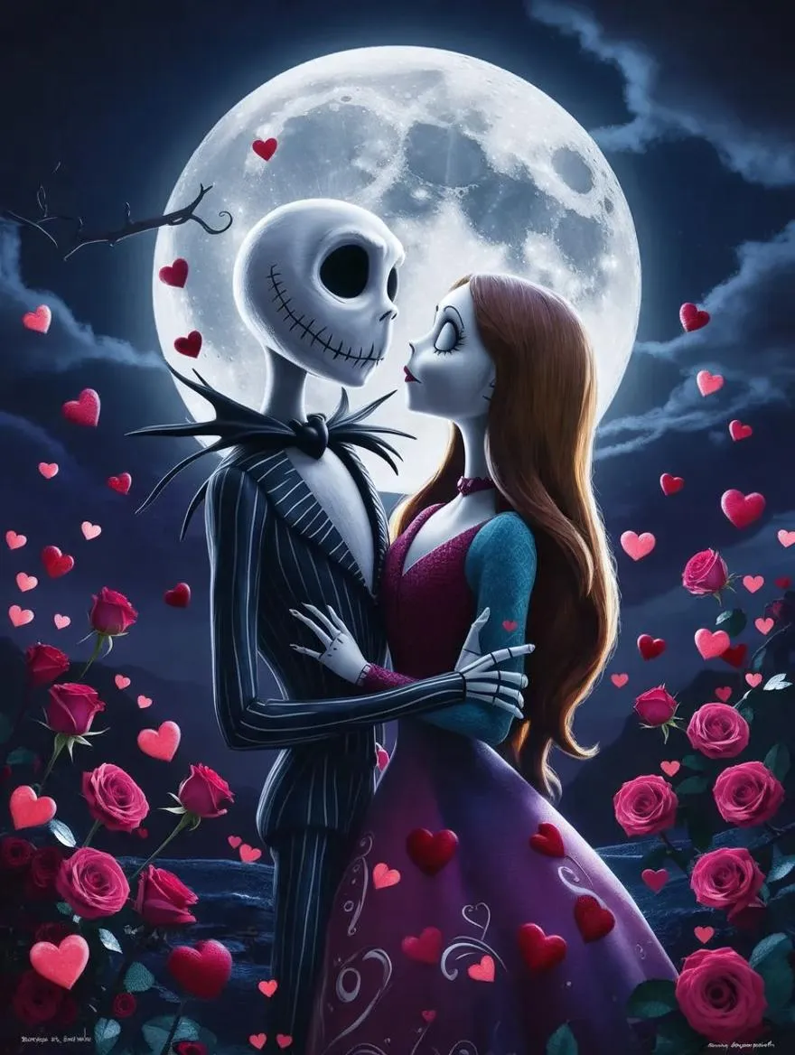 Generate Tim Burton-inspired AI visuals of Jack Skellington and Sally in a Valentine's love scene. Featuring gothic romance, roses, moonlit skies, and cinematic stop-motion style. Perfect for eerie yet heartfelt AI art with depth of field and Burtonesque charm.