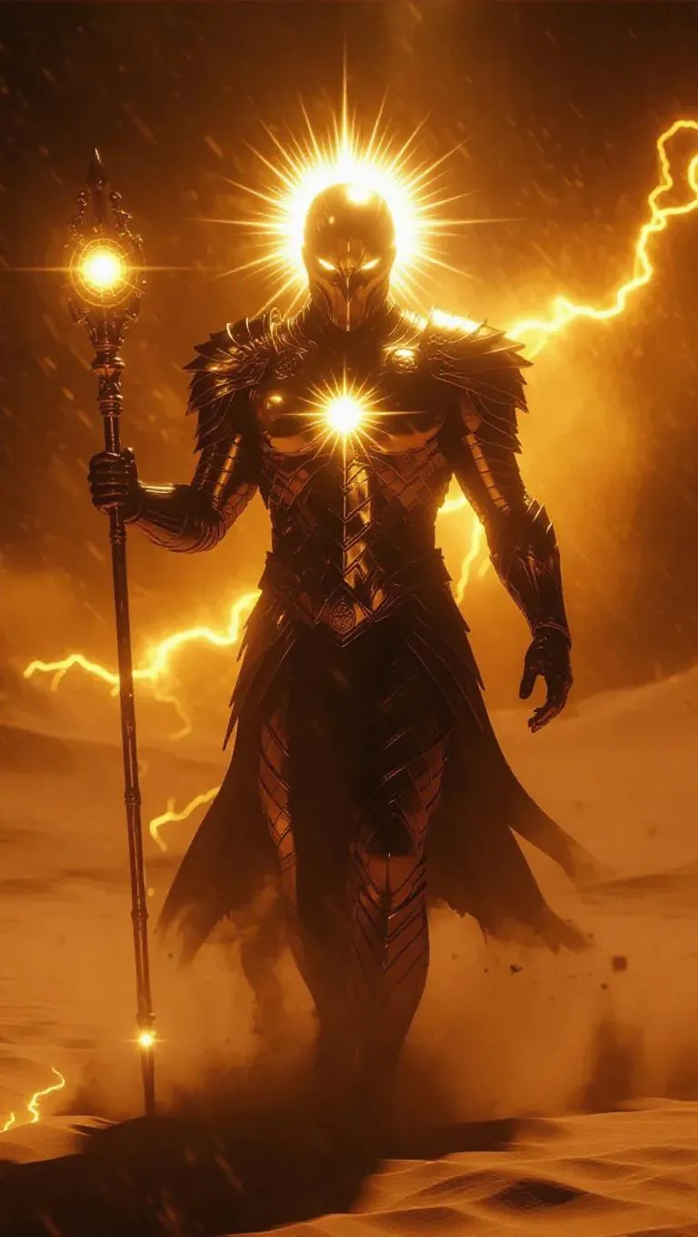 Hyper-realistic AI art of a towering golden hawk deity in sun-forged armor, wielding a fiery solar staff. Divine heat aura radiates through a blazing desert storm, melting sand beneath glowing footsteps. Solar flares illuminate hyper-detailed divine imagery. Create awe-inspiring AI visuals with vivgo.ai.
