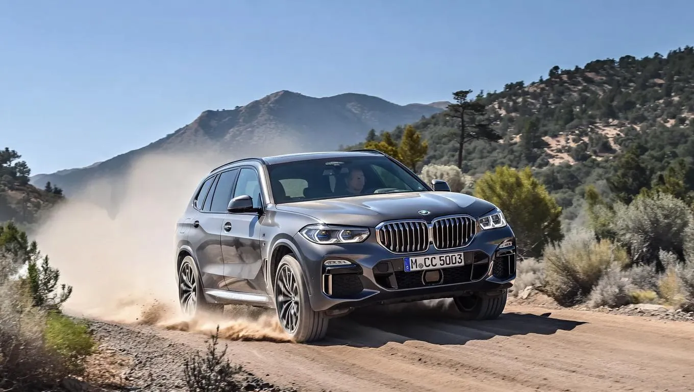 Create a dynamic off-road scene with the 2025 BMW 5 Series using AI image generation. Transform text prompts into rugged terrain visuals, showcasing the luxury sedan conquering dirt trails, rocky paths, and wilderness landscapes with realistic details, perfect for automotive enthusiasts and adventure-themed content creators.