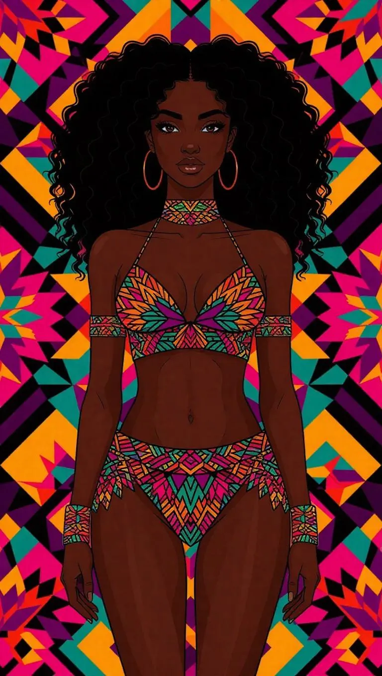 Digital illustration of a dark-skinned black woman, 27 years old, with lush curly hair, adorned in a vibrant loincloth. Set against a dynamic background featuring bold geometric shapes and intricate floral patterns, exuding a sense of cultural richness and modern flair.