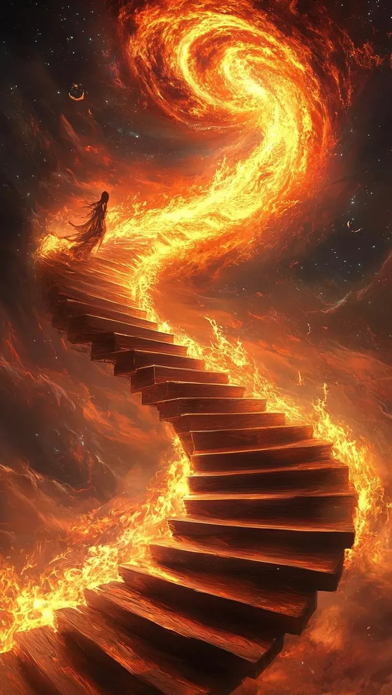 Explore AI-generated celestial fantasy art of a floating staircase ascending into a fiery vortex of music. Each step embodies emotional fire-notes—rage, sorrow, joy, longing, guilt, serenity, awe—with rich gradients, symbolic lighting, and reality-shifting forms. Craft multidimensional visual storytelling in celestial style using Vivago.ai's AI image generator for intense, symbolic creations.
