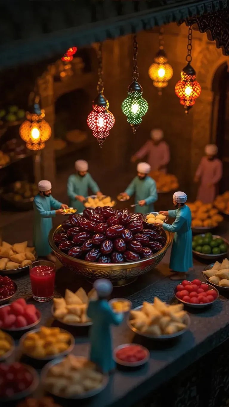 A photorealistic miniature scene of a bustling Middle Eastern marketplace during Ramadan, detailed food preparations. Tiny figures in light blue and teal tunics with white headwear actively prepare and serve food. A large ornate bowl of dates centers the scene, surrounded by tall glasses of reddish-pink juice. Figures prepare samosas, handle watermelon, and other foods. Hanging colorful lanterns cast warm ambient light over the dark, stone-textured surface. Low perspective emphasizes intricate details, capturing the festive, cultural ambiance. Traditional Islamic decorations and culinary elements highlight the spirit of Ramadan.