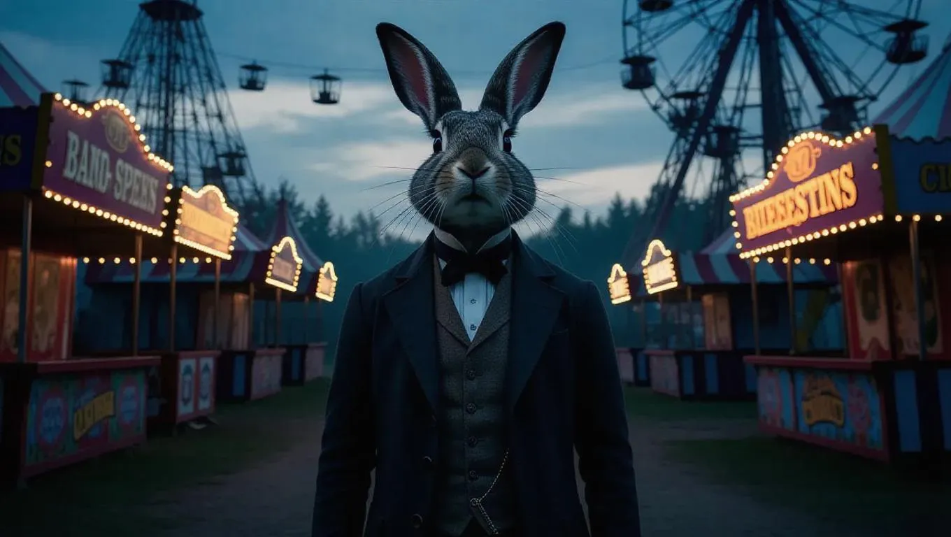 A low-angle, slow-motion dolly shot of a lone figure standing in the center of a dimly lit, eerie carnival at dusk, the only sound being the distant, haunting calliope music. The man, dressed in a worn, 19th-century three-piece suit, has a rabbit's head, with long, silky whiskers and glassy, black eyes that seem to hold a deep sadness. His ears, long and perked, twitch slightly as he gazes upwards, lost in thought. In the background, dilapidated booths and rickety Ferris wheels loom, shrouded in mist, while the air is thick with the sweet scent of funnel cakes and the promise of forgotten dreams. The camera glides closer, the man's rabbit features illuminated by the faint, golden light of a lone, flickering lantern, as if spotlighting a forgotten mythical creature in a world that's left him behind.