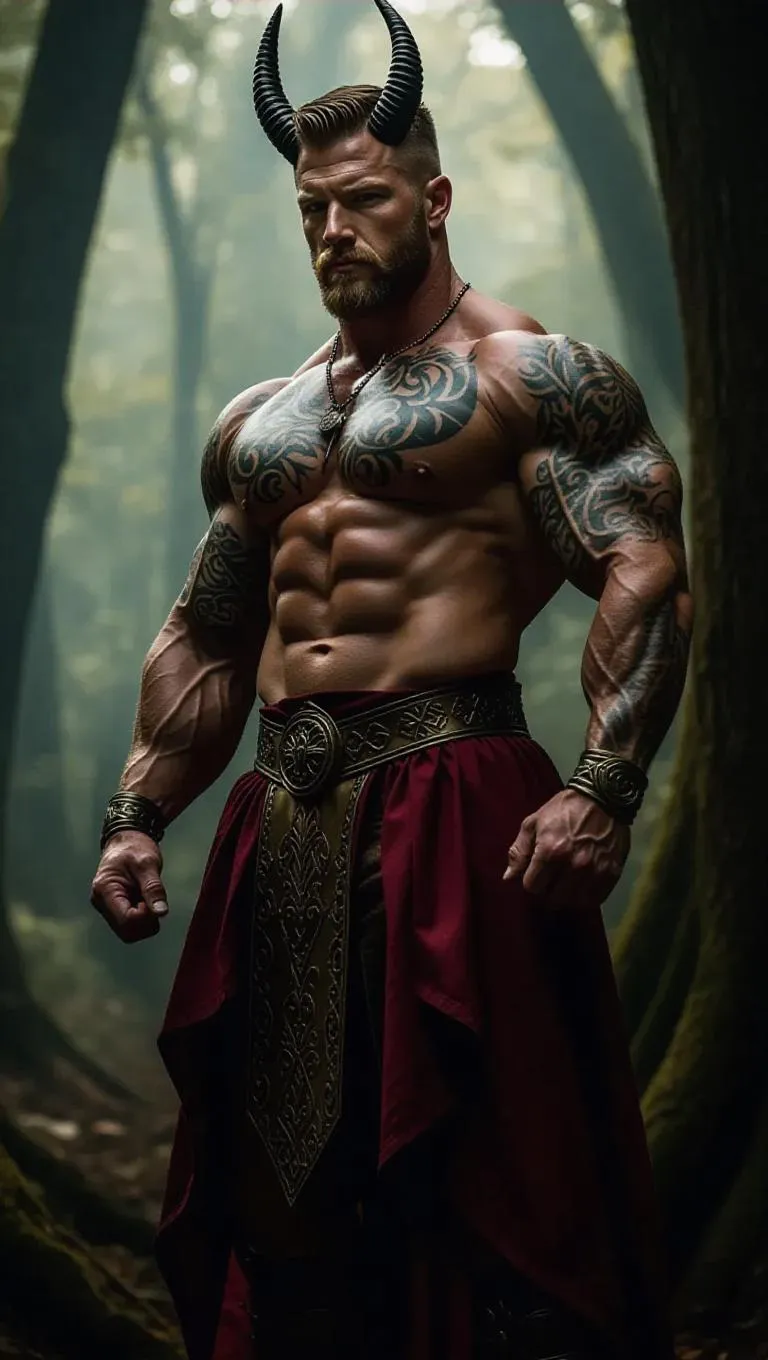 Horned red-skinned devil, great god Pan wizard casting magick spells, muscular bodybuilder Jay Cutler with intricate tattoos, embodying the charisma of Errol Flynn, Kirk Douglas, and Kurt Russell, standing amidst a dense forest with ancient, towering trees, exuding mystical energy and primal power.