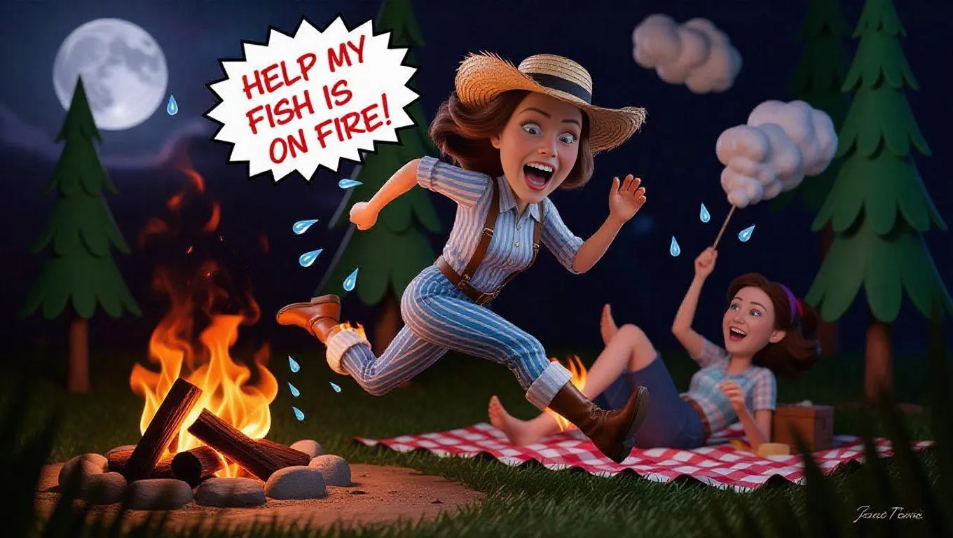 Panicked 3D cartoon female farmer sprints wildly, legs ablaze with comical orange flames, shouting chaos at a moonlit campsite. Campfire glows as her friend cackles on a checkered blanket, marshmallow skewer in hand. Exaggerated sweat, snapping suspenders, and cartoonish smoke amplify rural slapstick humor. Vibrant cel-shading, glowing outlines, and bouncy animation physics bring this chaotic campfire mishap to life.