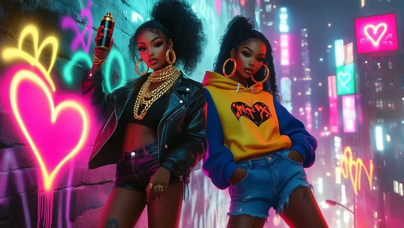 Create striking AI-generated art of Black woman cherubs blending urban edge and celestial charm. Contrast leather jackets, gold chains, and hoodies with glowing graffiti hearts sprayed on city walls. Explore futuristic street art styles, vivid spray-paint effects, and divine-meets-modern symbolism with AI tools for dynamic, culturally rich visual storytelling. Perfect for edgy digital art and contemporary myth-making.