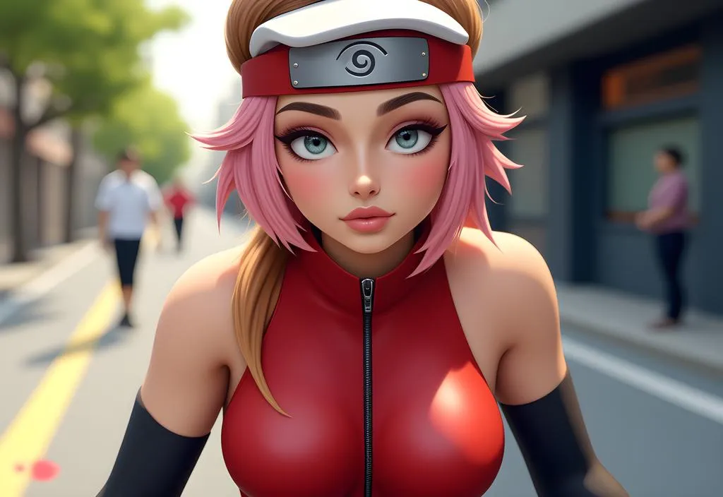 Generate an eye-catching anime character with vibrant pink hair, iconic logo headband, and striking red sleeveless costume. Craft confident poses on bustling urban streets using our AI prompt-to-image tools. Create standout characters against vivid city backdrops with Vivago.ai's generative art platform.