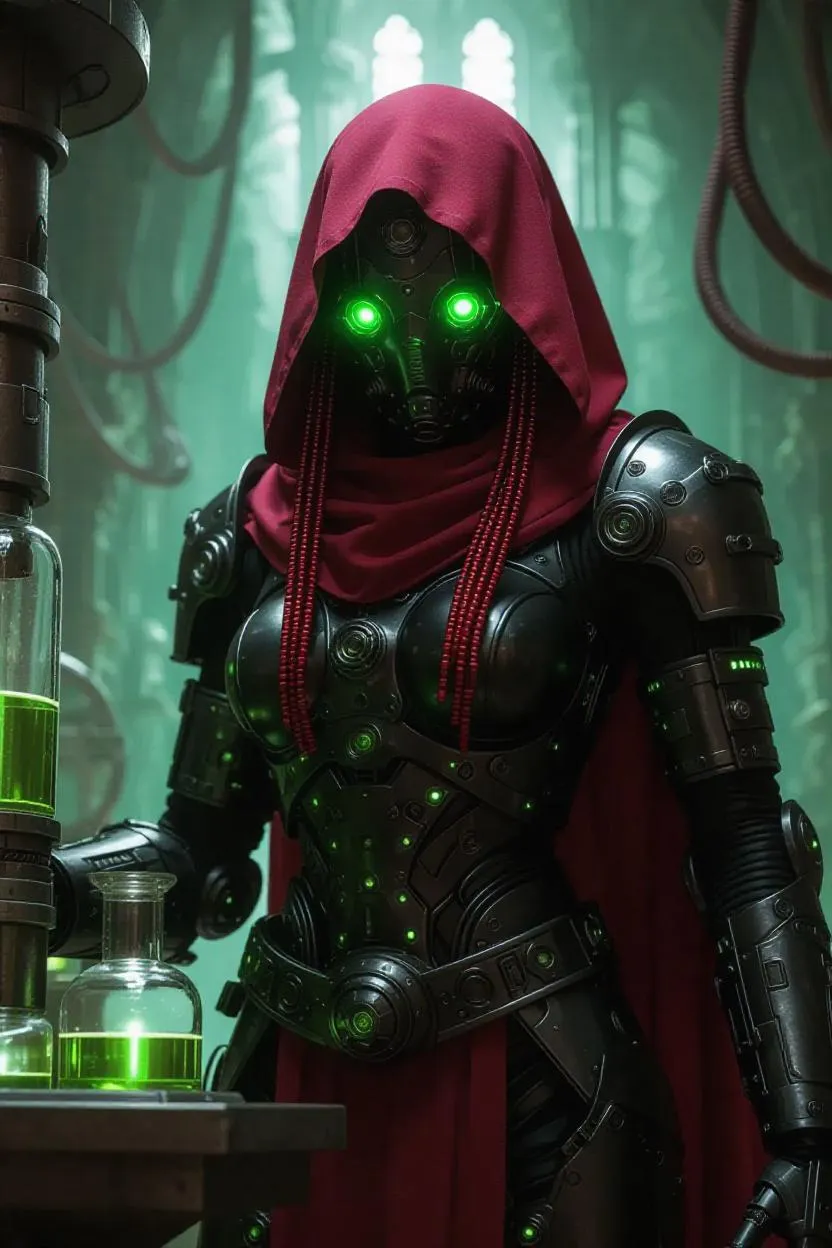 AI-generated ultra-realistic portrait of a cybernetic tech-priestess in a neon-gothic laboratory. Ebony-skinned figure with copper-cable hair, glowing bionic eyes, and serpentine mechatendrils wielding laser pistons, surgical tools, and scanning limbs. Matte-metallic textures highlight armored limbs, crystalline power cells, and biomechanical details. Full-body composition features hydraulic legs, bubbling chemical organs, and floating bio-horrors in amber. Ultra-high-resolution dystopian futurism with steampunk aesthetics.