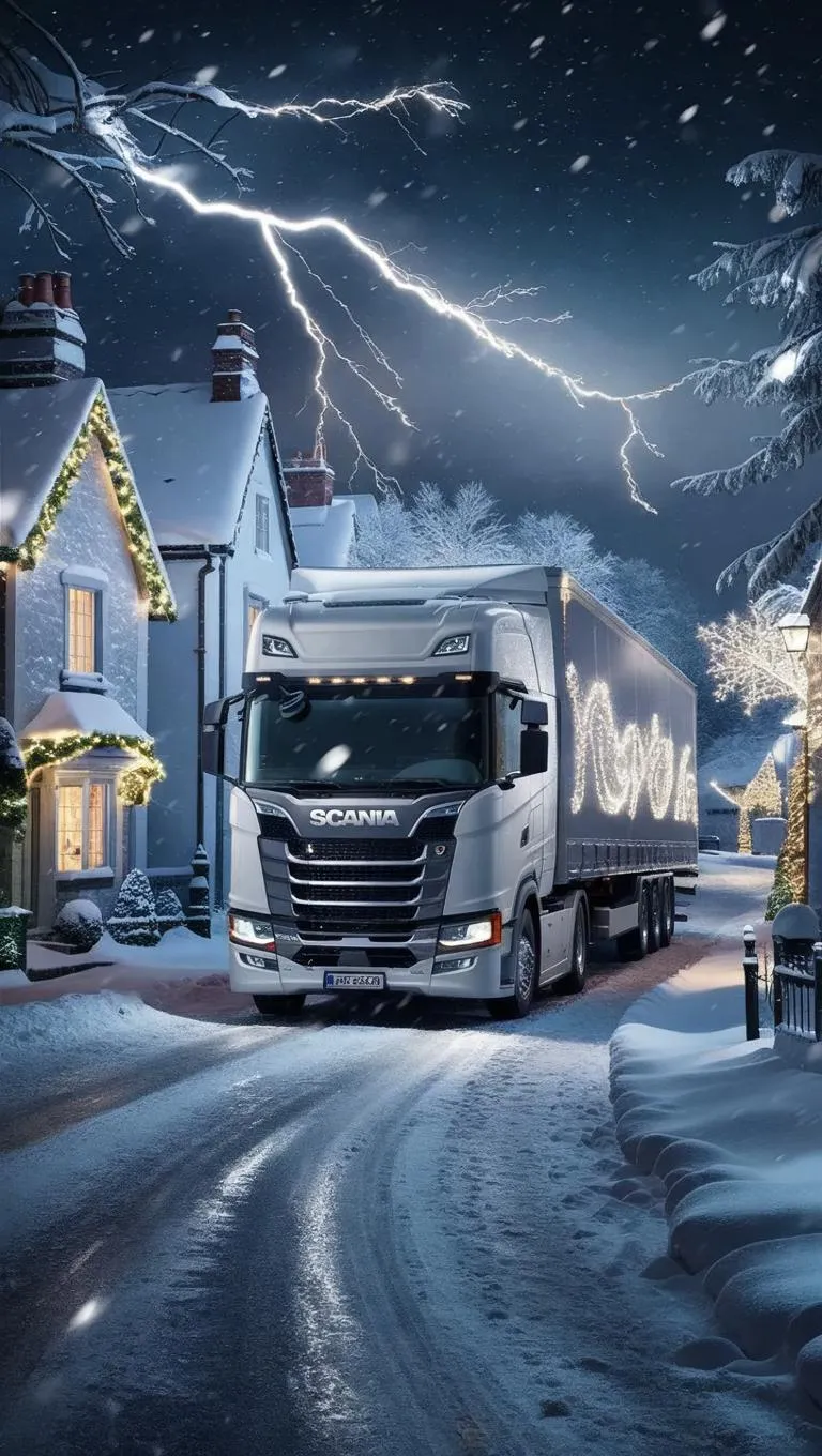 Generate a festive AI-powered Christmas scene: luminous LED-lit truck glowing on snowy streets, blending dynamic lighting effects with winter wonderland charm. Create holiday magic using vivago.ai's advanced image generator for seasonal branding, social content, or snowy night visuals.