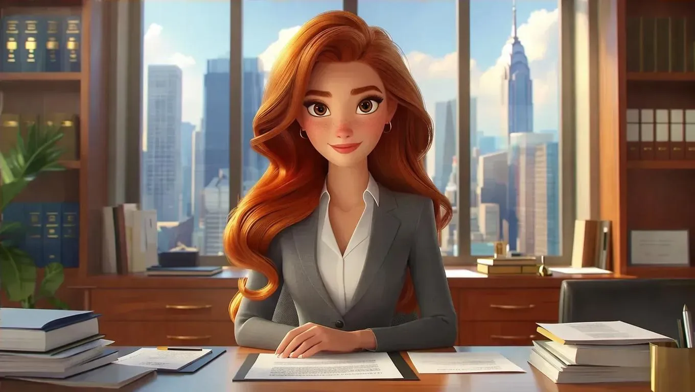 Create vibrant AI-generated Pixar-style art of a 30-year-old red-haired lawyer in her modern office. Featuring fair skin, amber eyes, and a distinctive upper ear piercing, this AI image blends professional charm with playful animation. Ideal for legal branding or storytelling. Design custom characters with vivago.ai's AI tools for dynamic, lifelike visuals.