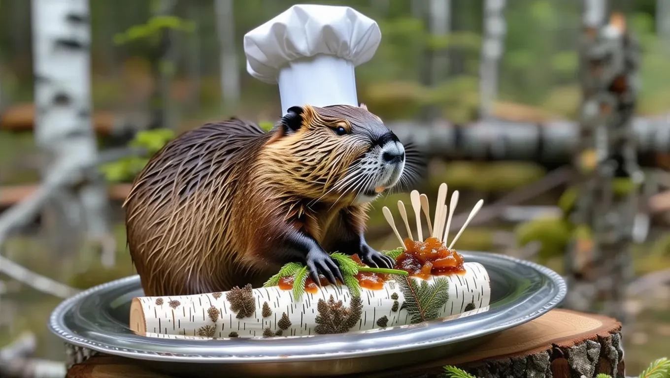 Generate a whimsical AI image of a beaver chef presenting a surreal forest feast - birch log platter with twig salad, bark relish, and tongue-depressor garnishes. Explore vivago.ai's creative AI tools for imaginative animal characters, quirky culinary scenes, and nature-inspired fantasy visuals in HD quality. Perfect for digital art enthusiasts and surreal storytelling projects.