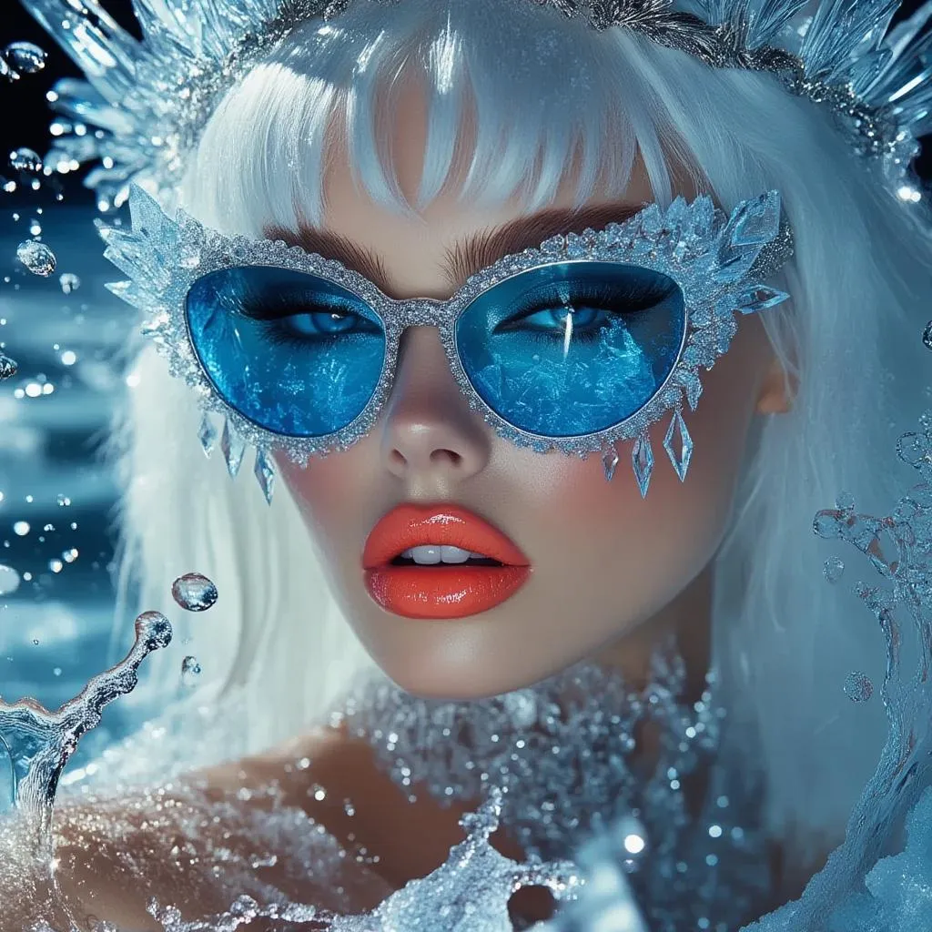 Create a striking ice queen fashion portrait with frosted platinum hair, crystal sunglasses & blue-tinted lenses. Explore surreal beauty through icy tones, water splashes, and high-fashion coral lips. Avant-garde editorial style enhanced by cinematic lighting, hyper-realistic textures, and 8K resolution for fantastical, high-contrast AI-generated imagery.