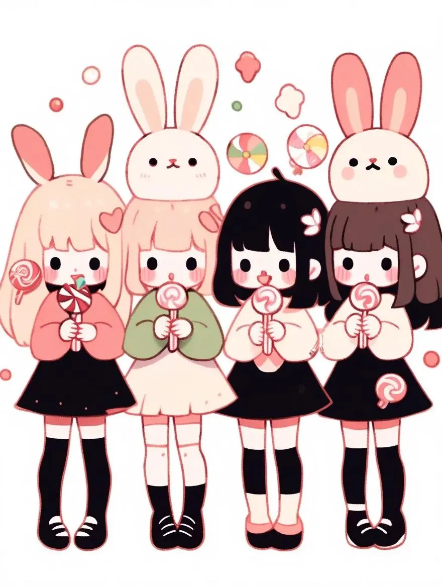 Generate vibrant AI sticker art of 4 adorable chibi girls with unique hairstyles, holding candy and bunny toys. Features kawaii-style outfits, flat colors, simple lines, and clean white backgrounds. Perfect for cute cartoon designs, colorful illustrations, and kawaii-themed projects with playful, full-body chibi characters in a minimalist aesthetic.