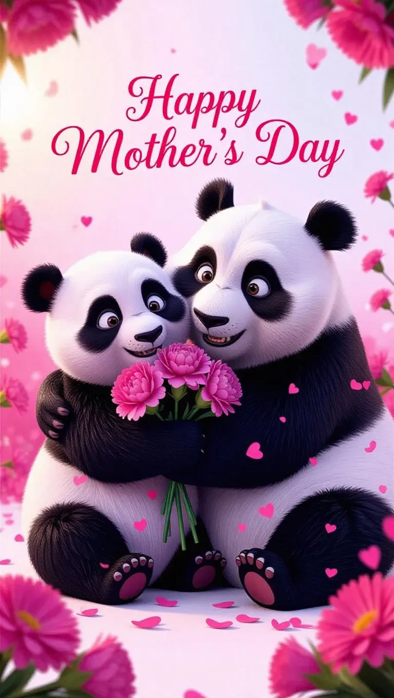 Generate heartwarming Mother's Day AI images with adorable Pixar-style panda duo. Featuring 8K ultra-detailed mother-baby pandas hugging amidst vibrant carnations, 3D C4D rendering on bubbly mat textures. Clean white background with light pink gradients and elegant cursive "Happy Mother's Day" text. Perfect for creating professional-grade sentimental illustrations combining AI creativity with cinematic quality.