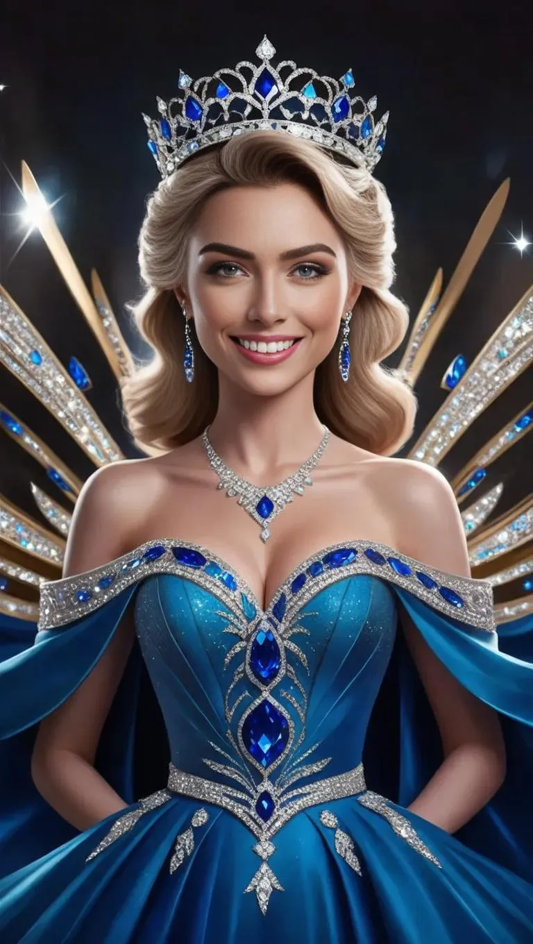 Create a stunning AI image of a confident woman in a royal blue dress, sparkling silver-blue crown, and radiant smile. Achieve lifelike elegance with 16K resolution precision. Perfect for high-quality visuals, portraits, or fantasy themes—craft professional-grade AI art instantly using VivaGo's advanced image generation tools.