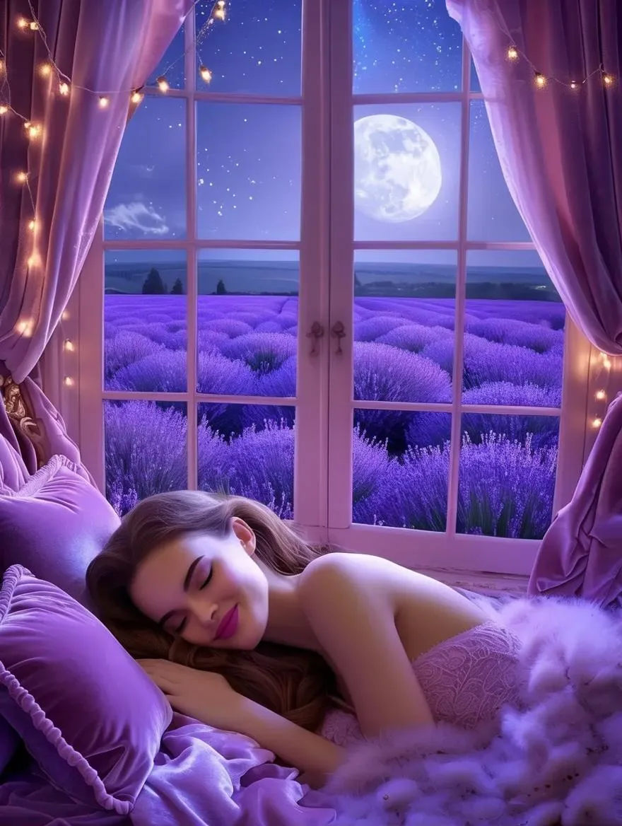 Step into an AI-generated dreamy boudoir with lavender-pink hues, plush velvet textures, and ethereal fairy lights. A tranquil beauty sleeps peacefully, radiating serenity, while moonlit lavender fields shimmer beyond. This enchanting AI scene blends magical ambiance, healing calm, and opulent details for a soothing visual escape. Explore ethereal tranquility and whimsical elegance in every AI-crafted detail.