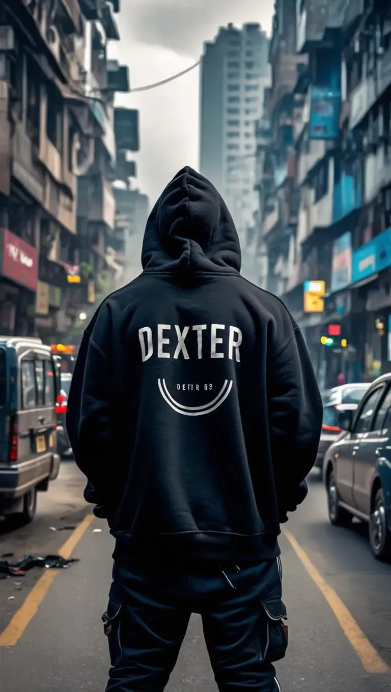 Generate a cyberpunk-style AI image of Dexter, a Black Indian rapper in a plain black hoodie, against Hyderabad's neon-lit streets. Capture back & foreground views for dynamic urban vibes. Explore AI-powered cyberpunk art & effects to blend Indian culture with futuristic aesthetics on VivaGo.ai.