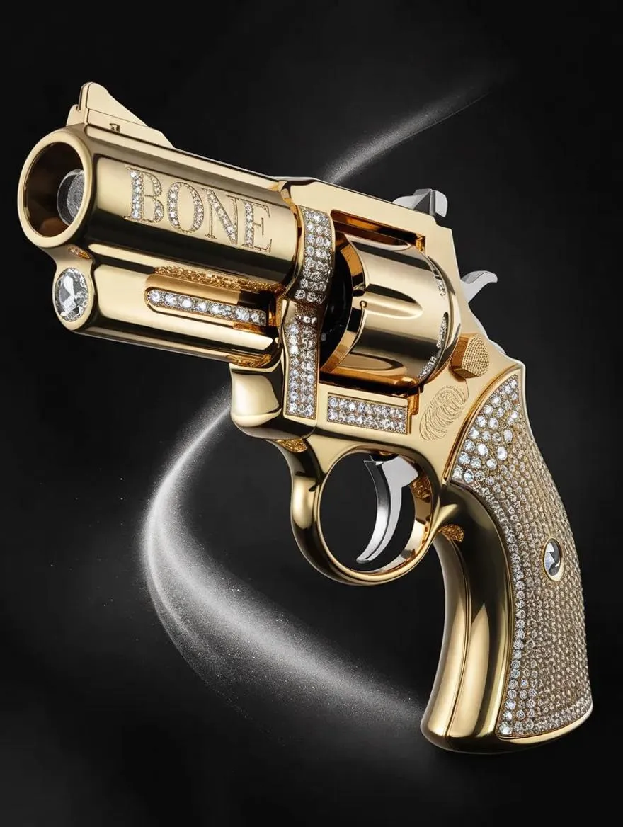 Craft striking visuals with a hyperrealistic gold gun in cinematic black & white. Featuring engraved "BONE" text and rhinestone-studded handle, this side-view closeup merges edgy fashion with AI precision. Ideal for high-contrast photography, concept art, or noir-inspired projects. Explore AI image generation for edgy, high-contrast fashion photography and cinematic storytelling.