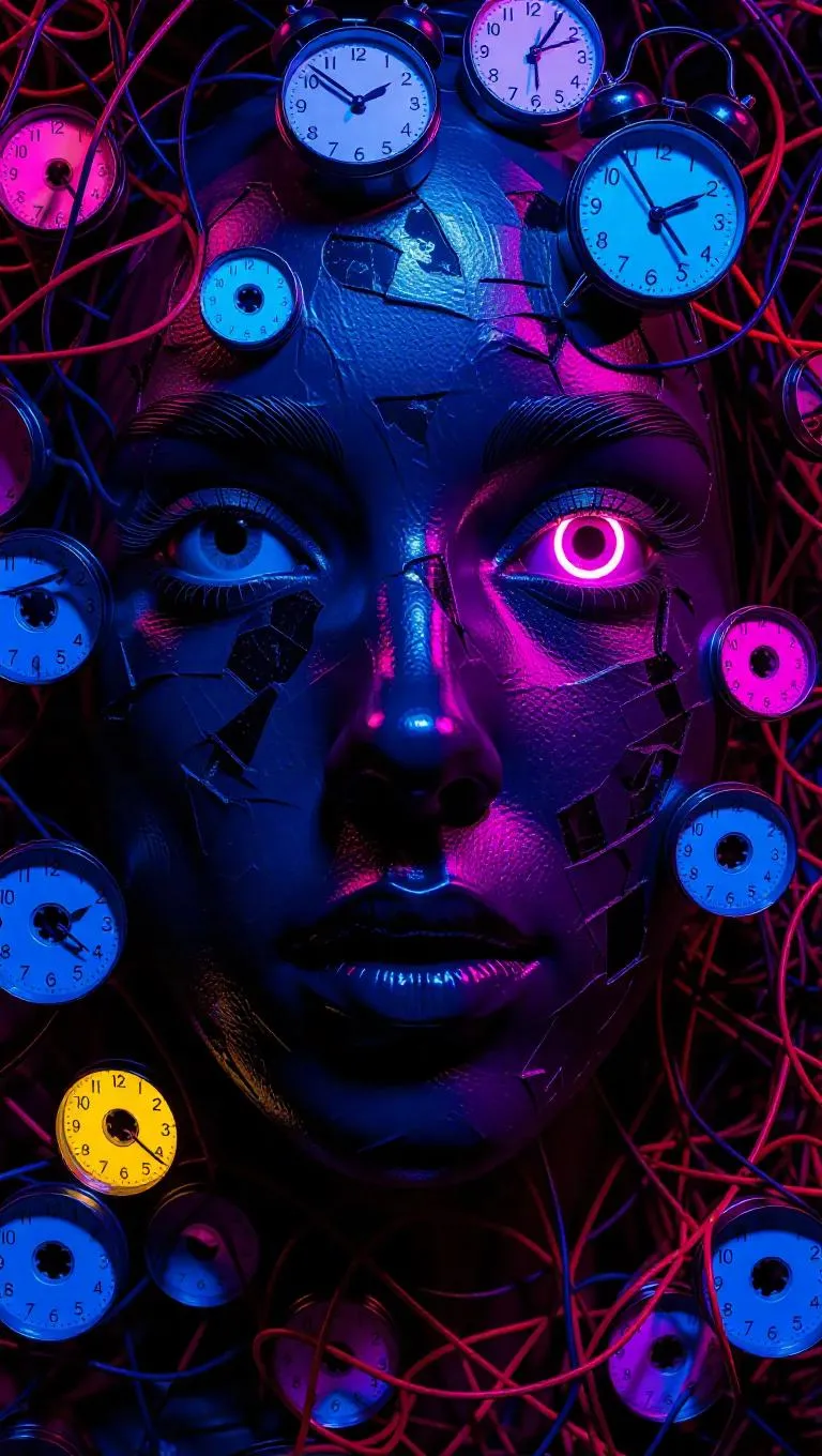 Experience pareidolia with this AI-generated optical illusion blending melting clocks, neon insects, and digital static into chaotic visual noise. Vivago.ai crafts hidden structures, subtly arranging abstract elements to reveal a human face from afar. Discover the balance between chaos and order in AI-driven creativity.
