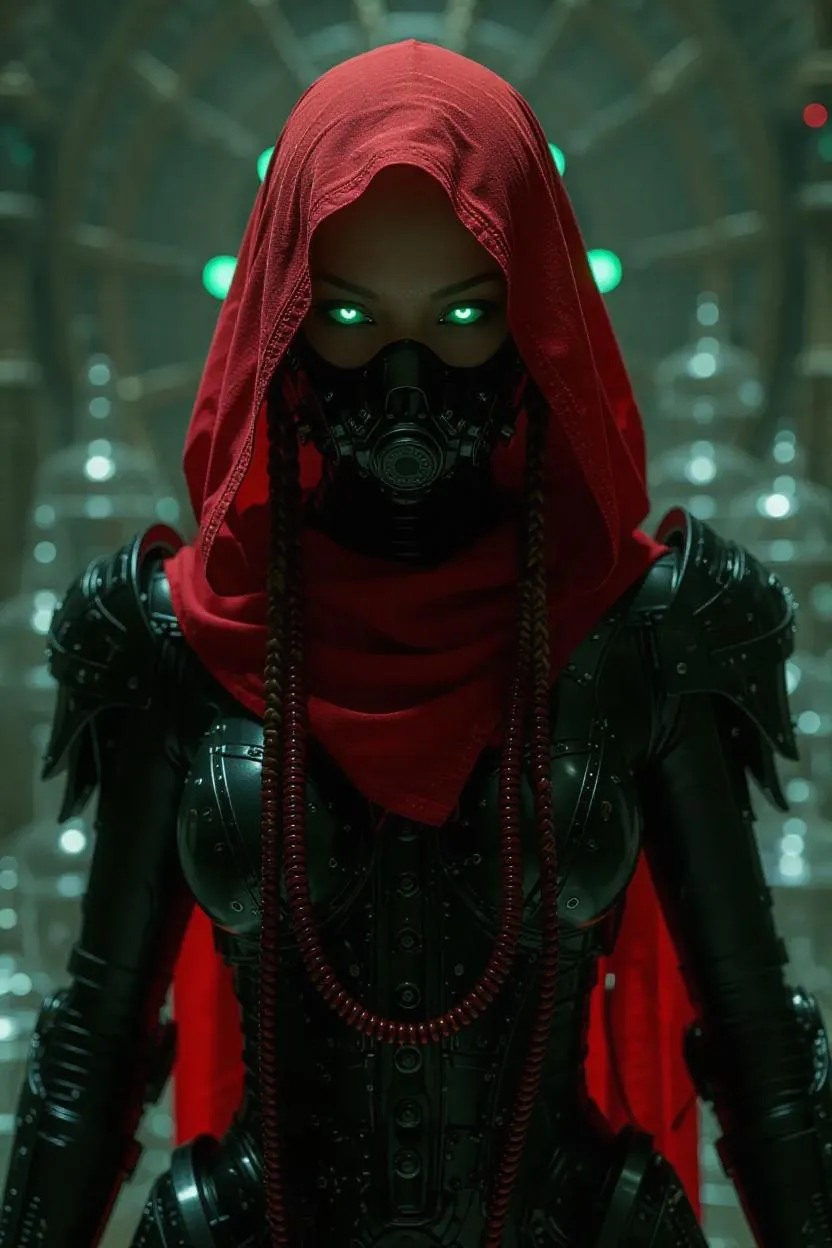 AI-generated ultra-realistic portrait of a cybernetic tech-priestess in a neon-gothic laboratory. Ebony-skinned figure with copper-cable hair, glowing bionic eyes, and serpentine mechatendrils wielding laser pistons, surgical tools, and scanning limbs. Matte-metallic textures highlight armored limbs, crystalline power cells, and biomechanical details. Full-body composition features hydraulic legs, bubbling chemical organs, and floating bio-horrors in amber. Ultra-high-resolution dystopian futurism with steampunk aesthetics.