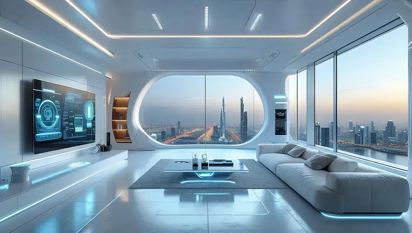 Design a sleek, minimalist futuristic apartment interior in white with AI-powered tools. Generate modern living spaces using cutting-edge technology for realistic 3D renders, virtual staging, and innovative design. Ideal for architects, designers, and tech enthusiasts seeking contemporary, tech-forward home aesthetics enhanced by professional-grade AI creativity.