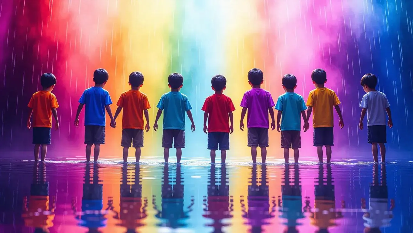 Digital watercolor illustration of a vibrant, colorful group of young boys playing in a puddle of water, light water showers pouring, inspired by Waterhouse, Carne Griffiths, Minjae Lee, Ana Paula Hoppe, intricate, complex contrast, HDR, sharp, soft cinematic volumetric lighting, flowery pastel colors, wide long shot, perfect masterpiece