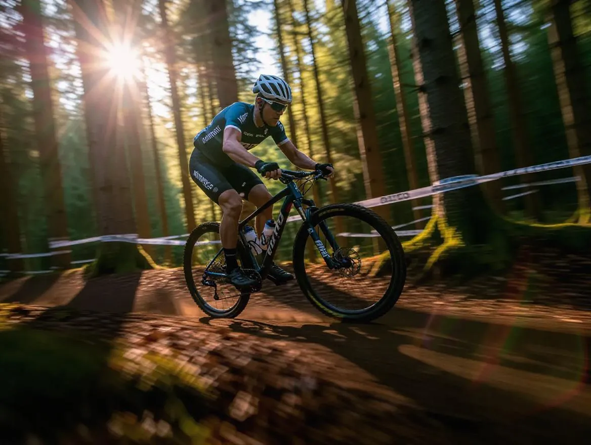 AI-generated visuals of a cyclist speeding through a forest trail with dynamic lighting and motion blur. Create high-energy sideways action shots using vivago.ai's tools for immersive, professional-grade sports imagery. Perfect for capturing speed, nature, and adrenaline in AI-powered scenes.
