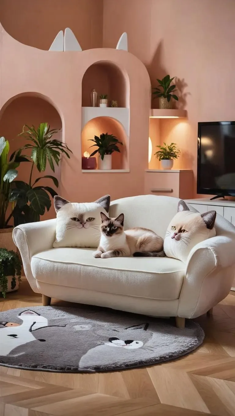 Transform your living room with whimsical cat-themed interior design. Explore AI-generated spaces featuring a cat-shaped HD TV, white sofa with matching pillows, Siamese cat companion, gray rug, lush plants, parquet floors, and peach walls. Perfect for playful, modern decor lovers. Create your dream quirky, cozy space using Vivago.ai's AI tools for unique furniture concepts and vibrant room transformations.