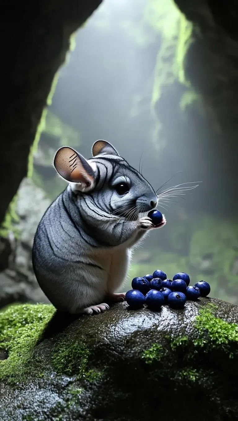 Ultra-realistic 4K AI-generated image of a silver-gray chinchilla in a misty mountain cave. Cinematic lighting highlights photorealistic textures, mossy rocks, and wild blueberries. Captures delicate whisker movements, lifelike chewing action, and immersive nature ambiance. Hyper-detailed animal behavior meets serene cave atmosphere with realistic sound cues. Ideal for wildlife enthusiasts, digital artists, and 4K content creators seeking cinematic photorealism. Powered by vivago.ai's AI image tools.