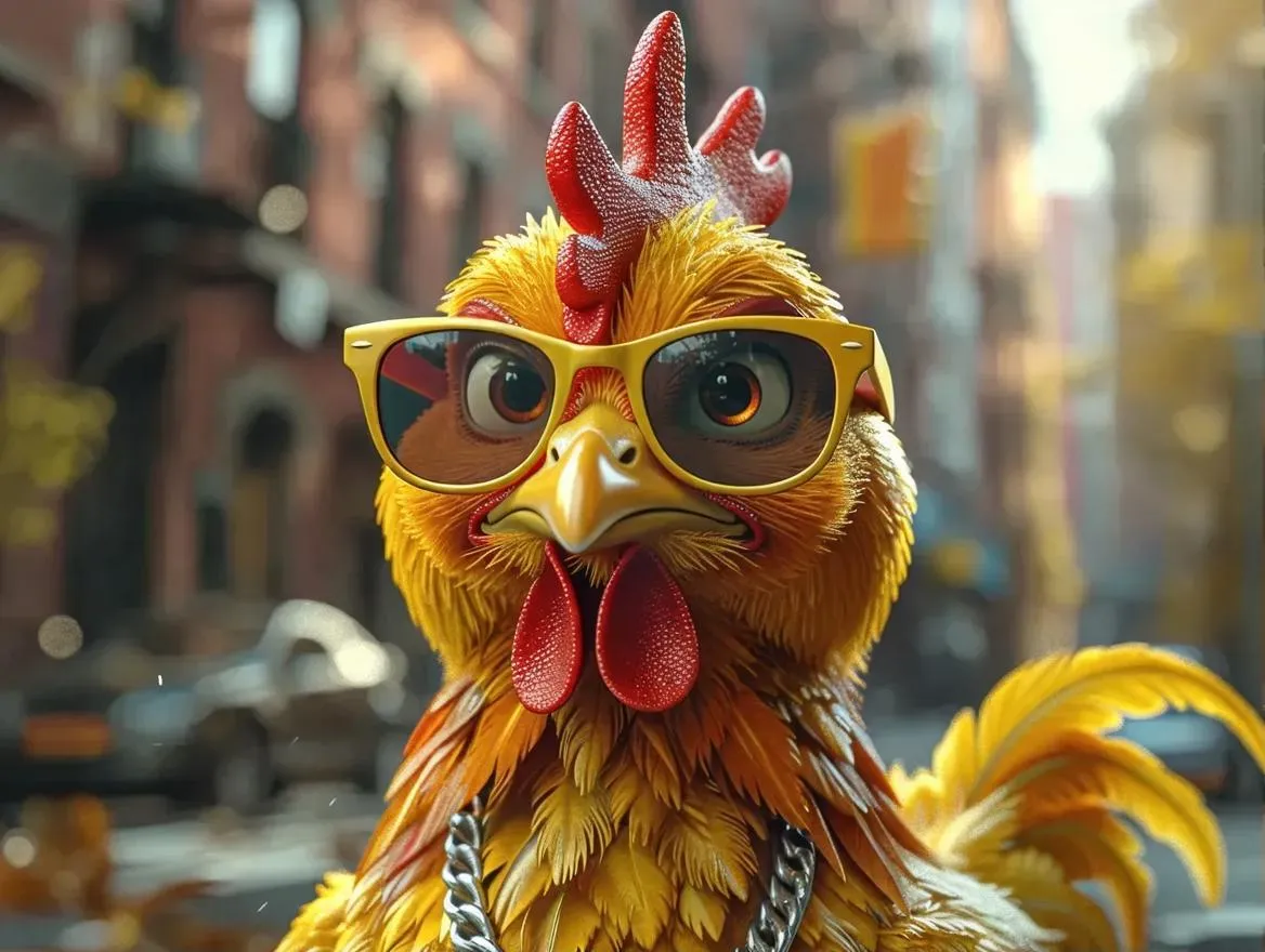Create a bold AI-generated logo: stylish yellow chicken with sunglasses, edgy hip-hop vibe, and realistic cartoon animation. Powered by VivaGo.ai's AI art tools for dynamic character design – perfect for music brands, streetwear, or urban content creation. Transform concepts into eye-catching visuals effortlessly.