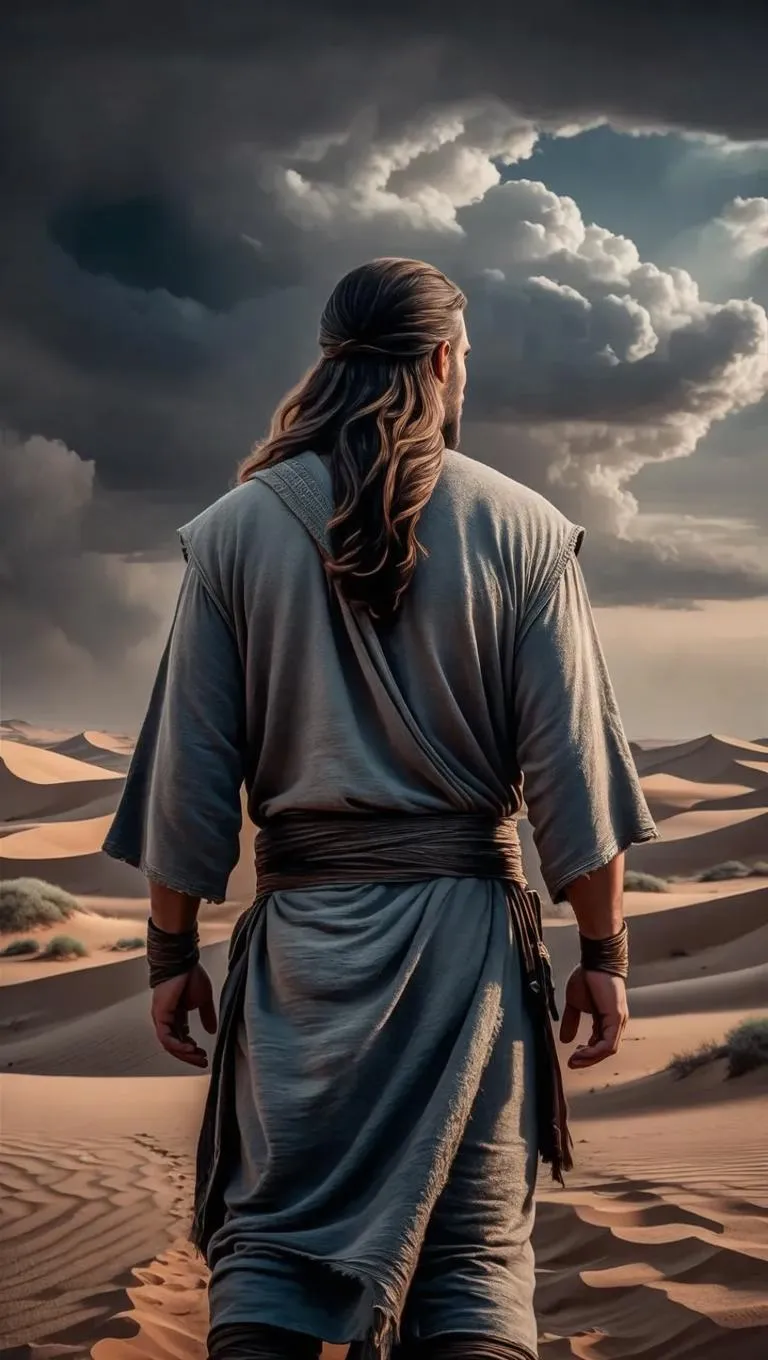 Generate a dramatic rear-view scene of a long-haired man in a gray tunic facing a desert oasis under brooding skies and an approaching sandstorm. Inspired by Mad Max aesthetics, this AI-powered image blends post-apocalyptic tension, dystopian atmosphere, and cinematic realism for immersive storytelling or concept art.