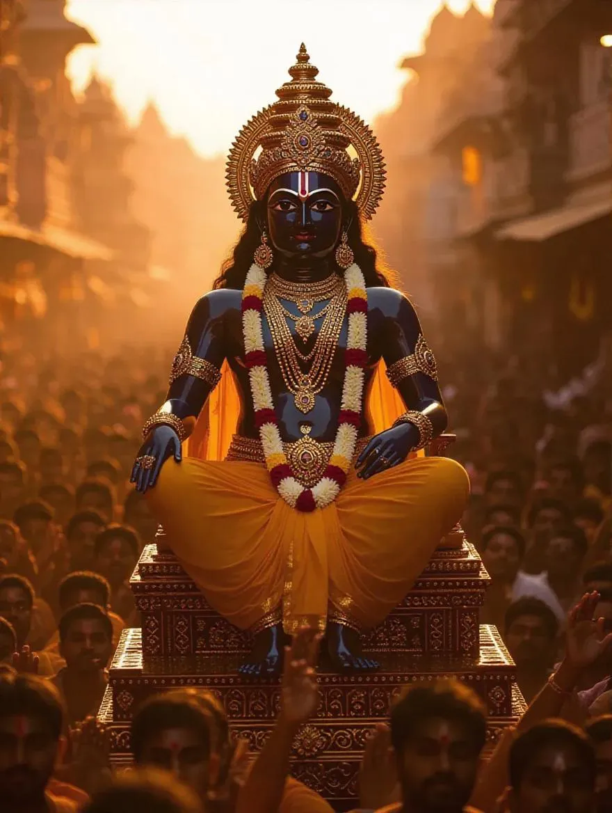 Generate vibrant AI visuals of Lord Jagannath during Ulto Rathyatra! Capture the deity atop his Puri chariot bathed in golden sunset glow, radiating calm amidst ecstatic devotees. Our AI creates a dynamic low-angle shot emphasizing the towering, intricately carved ratha, swirling crowd energy, fragrant incense, and festive devotion atmosphere. Perfect vivid imagery of this sacred journey.