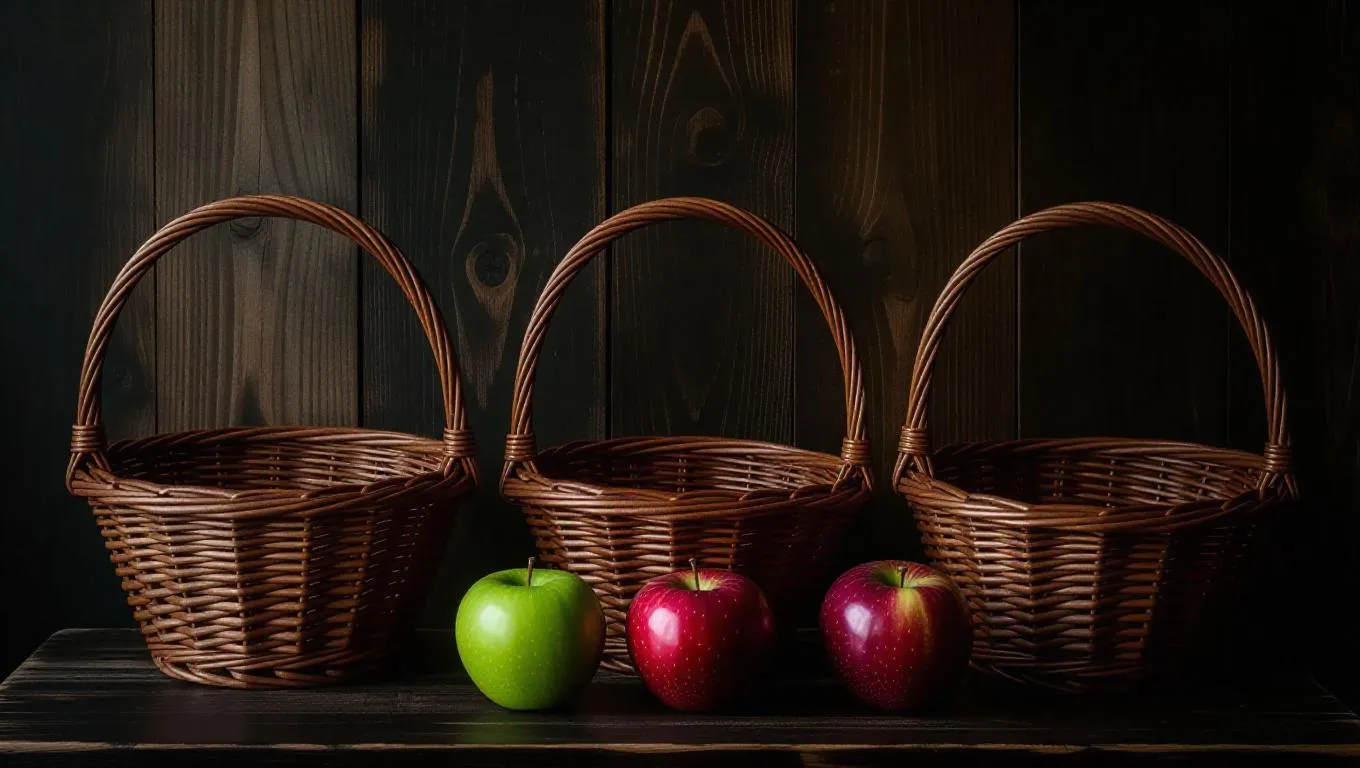 Generate a rustic still life scene with empty wicker baskets and glossy multicolored apples on dark wood. AI-enhanced photography captures vintage textures, earthy tones, and vivid realism. Features film grain effects, front-view compositions, and natural lighting for authentic, professional-grade visuals with timeless ambiance.
