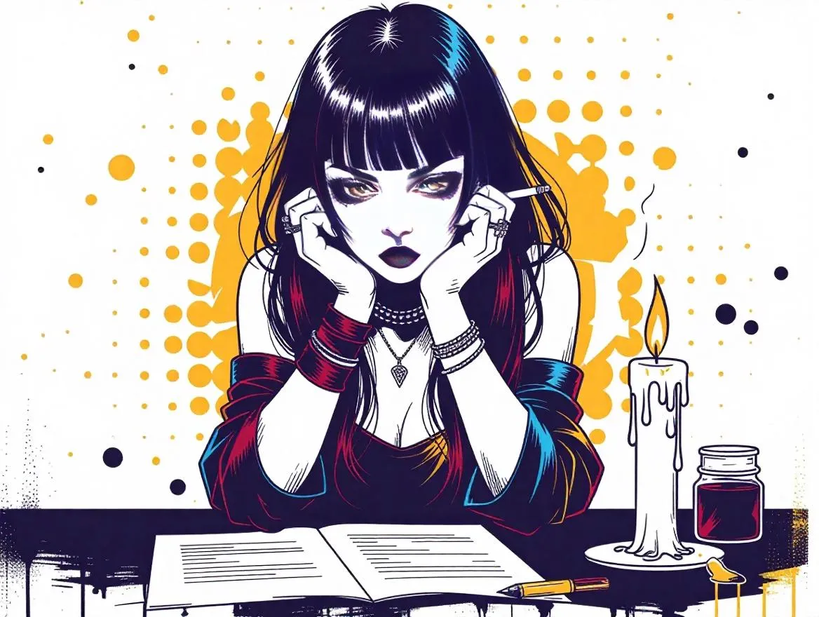 Generate edgy punk comic artwork with AI - dark blue, acid yellow & maroon goth girl at a table with papers & smoking candle. Create silvery white grain dots static art effects effortlessly on VivaGO.ai. Transform ideas into striking comic visuals.
