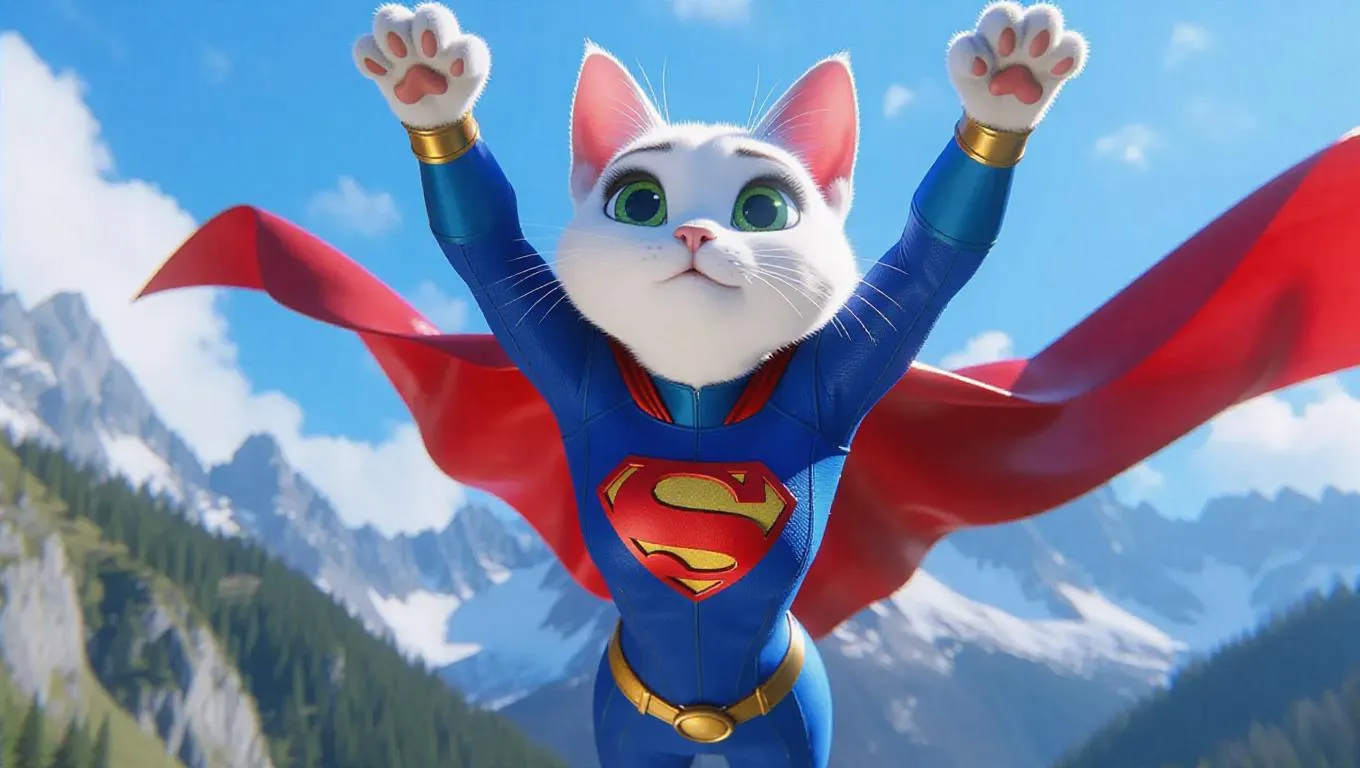 Create a white superhero cat with striking green eyes and a vibrant blue suit using AI image generation. Capture dynamic flight poses, flowing red capes, and golden accents against mountain backdrops. Elevate your visuals with professional editing tools for stunning, energetic superhero art. Perfect for comics, animations, or imaginative projects.