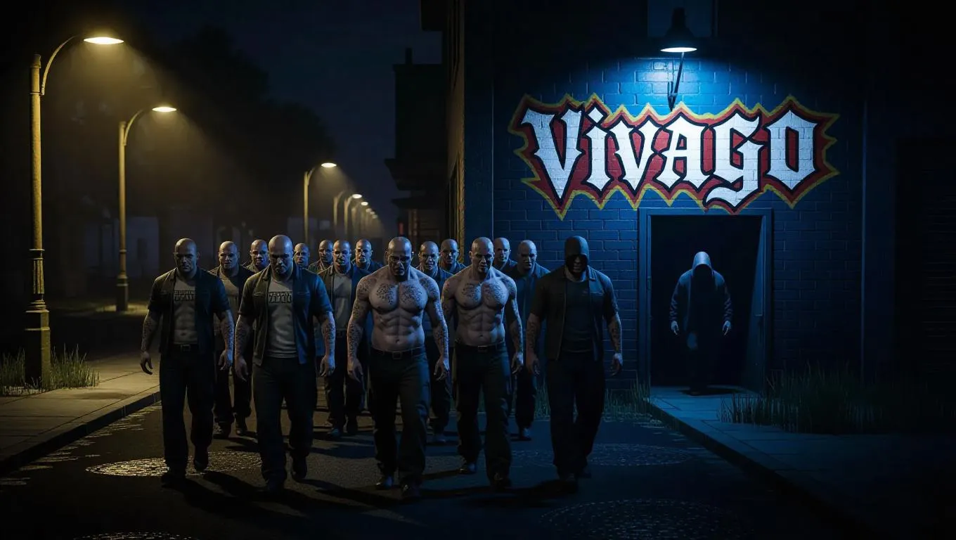 GTA-style image, with a gang of dirty, tattooed thugs walking through a seedy neighborhood at night, with yellow streetlights and deep shadows. On the wall of an abandoned building, a colorful graffiti with the word "VIVAGO" in gothic characters, while a hooded figure disappears into the shadows. The scene is shot with a low aerial camera angle, with a wide-angle lens to emphasize the desolation and danger of the place.