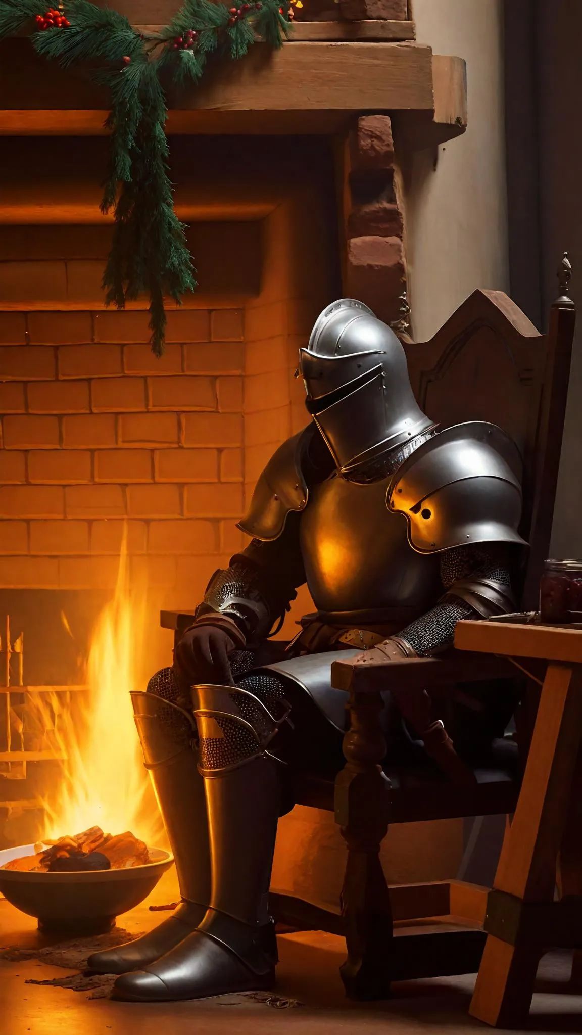 Step into a cozy medieval scene with this AI-generated image: a knight in armor relaxes by a blazing fire, a festive Christmas tree glowing nearby. Details like an ornate bowl, rustic broom, and warm hearth evoke holiday charm. Create your own vivid, imaginative visuals with VivaGO.ai's AI art tools.